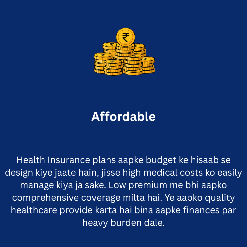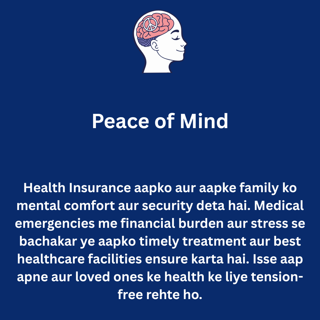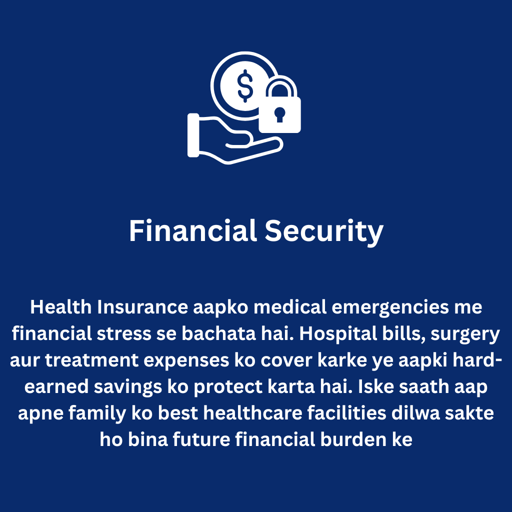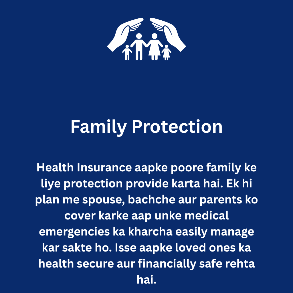 Health Insurance ek aisa financial shield hai jo aapko aur aapke family ko medical emergencies me protection deta hai. Rising healthcare costs ke time me ye policy hospitalisation, surgery, medicines aur treatment expenses cover karke aapko financial stress se bachati hai. Health Insurance ke saath aapko quality healthcare milta hai bina apni savings todhe. Ye sirf ek policy nahi, balki ek zaroori step hai apne aur apne parivaar ke health aur future ko secure karne ka.